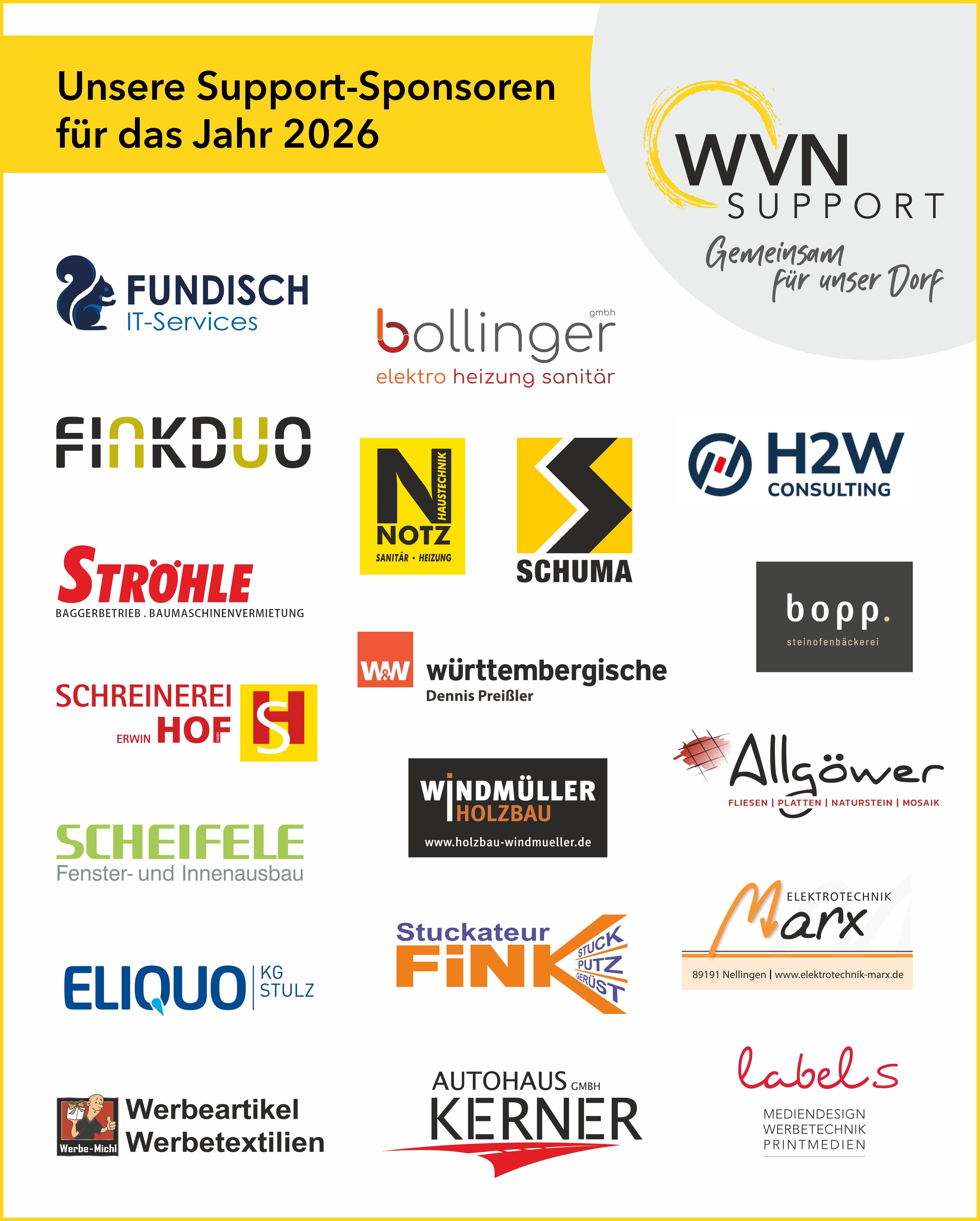 Der Erlös, der in unserem WVN-Support zusammen kommt, wird in gemeinnützige Zwecke, die Infrastruktur oder auch in unvorhergesehene Notlagen von Menschen in unserem Dorf verwendet. Gemeinsam mit und in der Gemeinde wollen wir was bewegen - Aktionen, Kulturveranstaltungen & wo Bedarf ist, helfen. Wir sagen Danke für die Unterstützung, die Allen zu Gute kommt und laden herzlich ein. DANKE sagen wir auch an unsere Support-Sponsoren im Jahr 2025 für ihre Unterstützung!